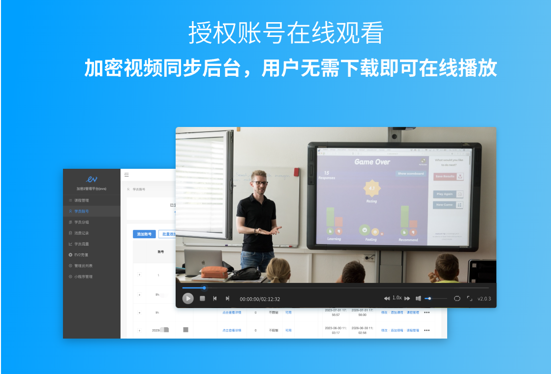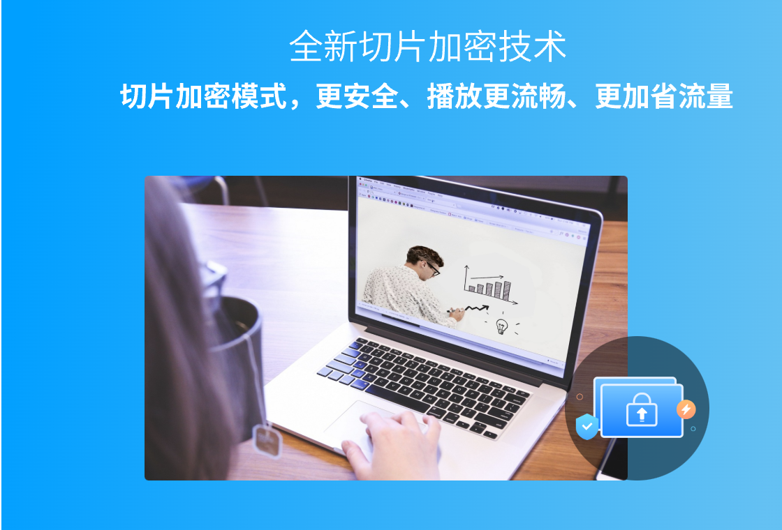 EV加密2是采用256位AES变形算法高强度逐帧加密防止翻录。通过加密技术将视频进行切片分割,切片后的加密视频播放更流畅,学员在线观看加密视频时自动缓存视频,无需手动下载。同时通过加密切片,保障加密视频的安全。