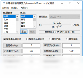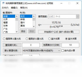 暴雨强度公式是反映降雨规律、指导城市排水防涝工程设计和相关设施建设的重要基础。该软件是为了汇集国内所有的、最新的省市区县暴雨强度公式而制作的一个软件工具,包含1000多条暴雨强度公式,还仍在不停添加更新。当您需要快速查找计算一个地区的最新暴雨强度公式的时候,可以试试这个软件。