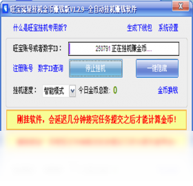 旺宝挂机网赚软件是一个著名的网赚程序,只要你开启软件挂机,就能够自动挂机赚钱,是目前互联网上最方便最快捷的网赚工具。赚的钱取决于你的挂机时间长短,只要您每天挂机 就会赚取相应的金币。