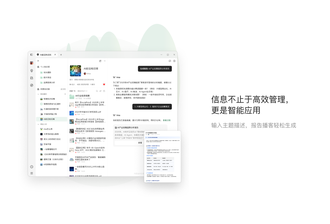 ima是以知识库为基础的AI工作台,提供“搜-读-写”一站式体验,具备以下核心功能: • 个人知识库:支持本地文件、微信文件、公众号文章、腾讯文档、网页、图片、音频等多种内容解读,构建专属“第二大脑” • 共享知识库:经验知识轻松共享流动,我的ima,也是我们的ima • 知识库广场:发现各领域优质知识库,别人的智慧为我所用 • 任务模式:输入主题描述,ima自动拆解步骤、查阅资料,为你生成报告/播客/PPT,还能一键导出 • 录音纪要:长达2小时录音,支持多种语言,自动生成原文和纪要,会议记录很轻松 • 双语对照翻译:外语论文PDF晦涩难懂,用ima打开,一键开启对照翻译 • 笔记:优质内容随手摘录记入笔记,随时唤起vibe writing,AI帮写生成文章、扩写、润色,还能一键配图 • AI生图:输入描述,快速生成指定比例、风格的图片,改到满意为止 • AI解读:上传文档,一键生成思维导图、真人有声播客、知识小测验,知识轻松消化 • 图文并茂:针对文档/知识库问答,自动匹配相关图表,内容更易懂