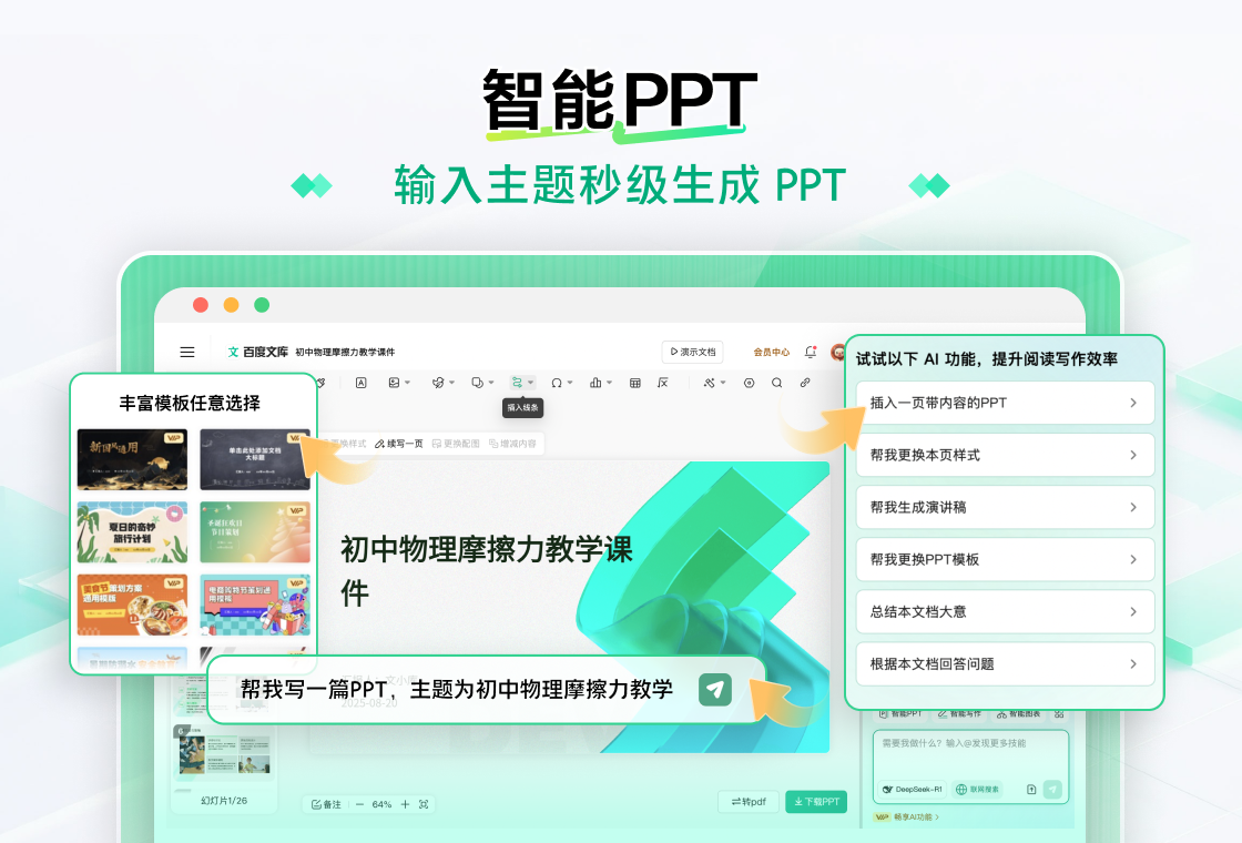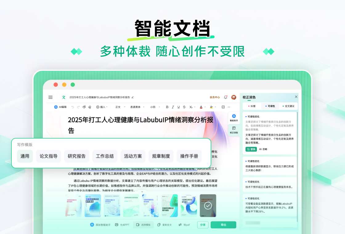 WPS Office“焕新升级”,满足一站式智能办公需求,开启AI高效新时代WPS 灵犀——AI办公智能体“WPS灵犀”与 WPS Office 深度协同,通过与“WPS灵犀”对话即可完成搜索、阅读、文档创作、演示文稿生成、图像生成、数据分析等众多场景任务,全程无需复杂操作和外部跳转,助力实现 AI 办公生产力的全新飞跃