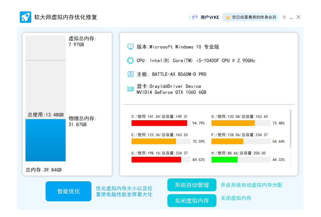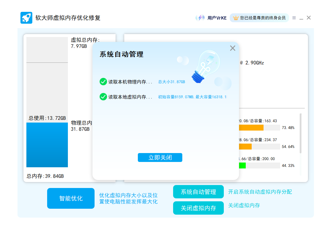 智能优化电脑系统的虚拟内存不足和报错问题,自动计算调整电脑最佳虚拟内存,并且支持一键开启系统自带的虚拟内存管理以及关闭虚拟内存。