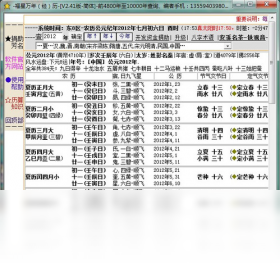 从前4800年到公元10000年共14800年的公历、农历、干支、九星、28宿、管局、三元九运、年号等;每个农历月可查初一、十一、廿一的干支、九星、28宿。