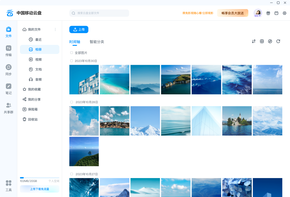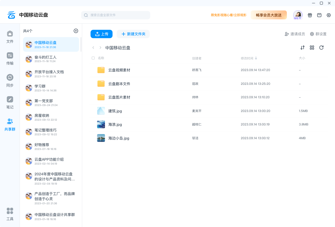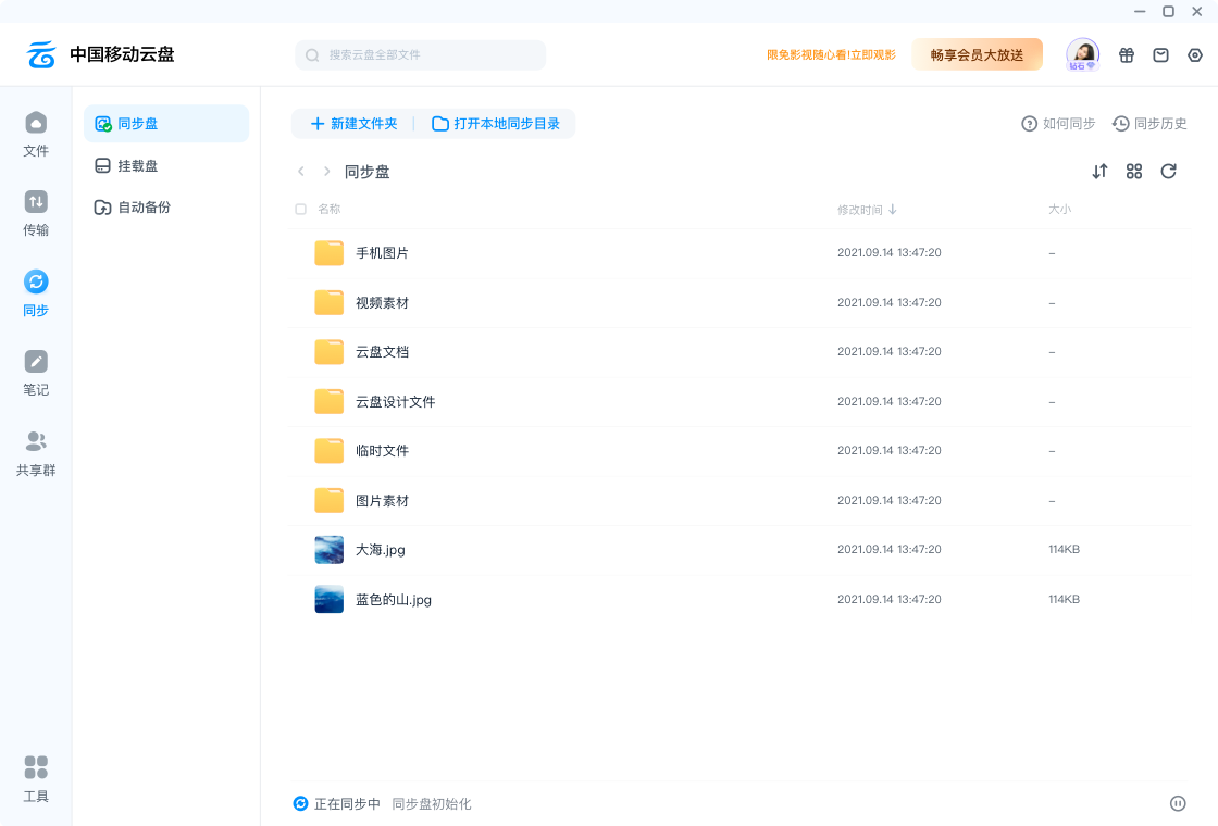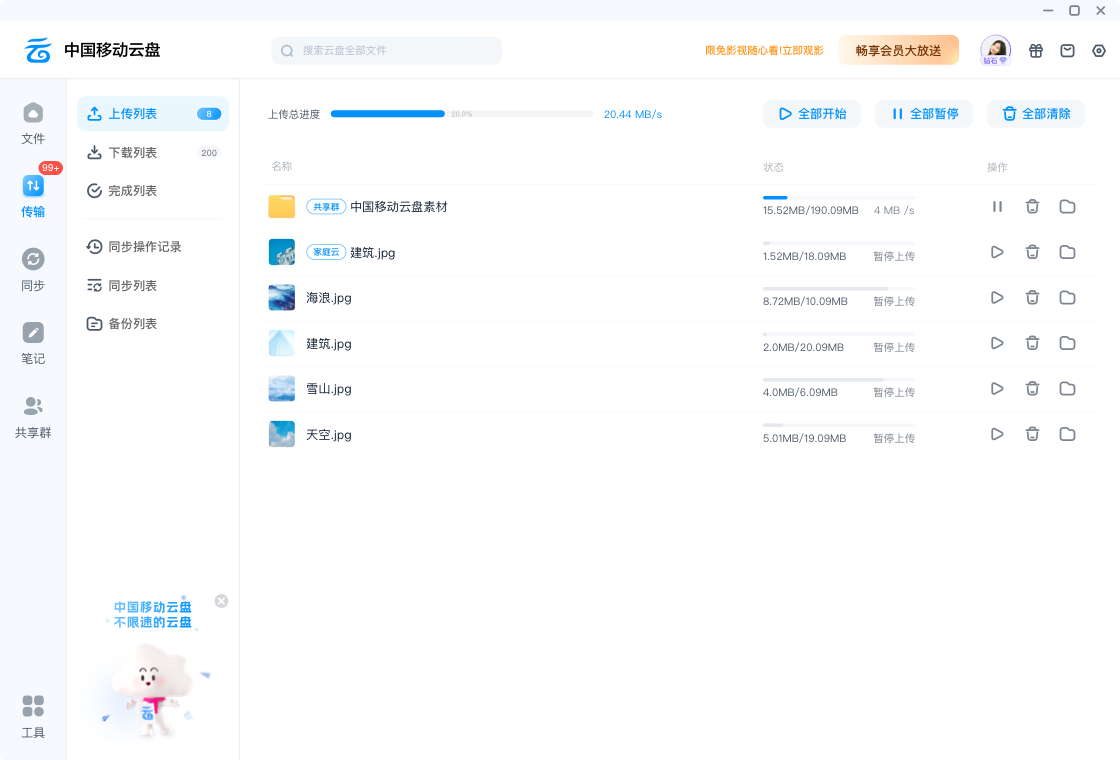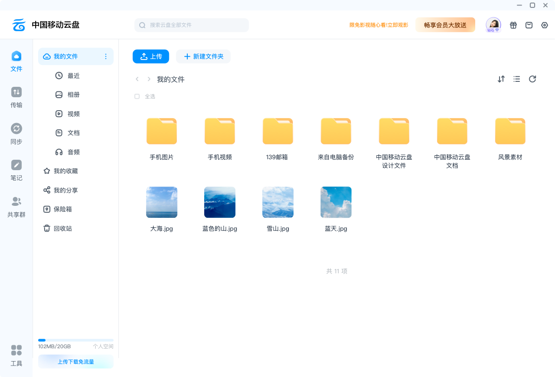 中国移动云盘(原“和彩云网盘”)为用户提供微信文件、手机图片、通讯录等数字资产的存储备份、在线管理、群组共享等服务;支持任一终端上传,所有终端 (APP、小程序、iPad 、PC、TV、网页端等) 同步可见。Windows同步盘支持多端双向增删改,为您背包减负担;Windows自动备份支持一键实时备份本地文件、微信/QQ聊天文件,清理内存不怕误删。用户可对手机、个人电脑、平板电脑等多终端、多应用中的个人数字内容进行云备份、同步和统一管理,而且用户可在线播放和浏览存储在云端的照片、音乐、视频等各种数字内容,还可对上述内容进行分享和传播。