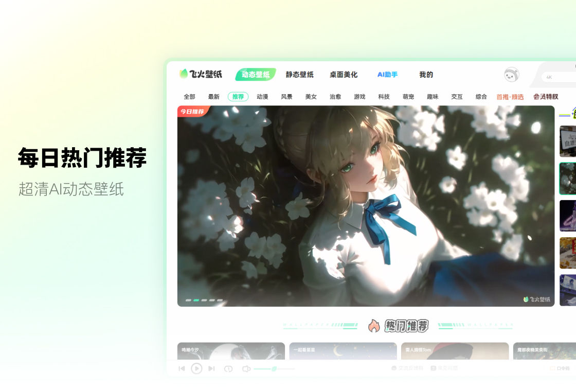 精灵壁纸为您提供丰富的超清4K动态壁纸、静态壁纸、互动壁纸和手机壁纸。全网首选的壁纸软件,畅享PC和移动双端,让你的桌面酷炫「动」起来!【动态壁纸】超酷炫动态壁纸、互动壁纸每日更新,分类齐全,个性化十足;【静态壁纸】4K超清静态壁纸随心用,一键设置;【桌面主题】海量创意主题,一键美化桌面;【桌面整理】一键整理电脑桌面各类文件,高效办公、学习;【美化工具】多种美化工具自由搭配,你的桌面由你定义;【畅享双端】PC和手机端账号、会员体系互通,让你随时随地畅快使用海量壁纸。