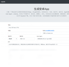 只需一个网址就可以将网页转换成安卓App,即.apk安装包。支持自定义包名、版本号、版本名、App标题、App图标、User-Agent、scheme。支持以下权限开关:麦克风、摄像头、定位。支持自定义自动横竖屏、强制竖屏、强制横屏。支持签名文件.keystore下载。