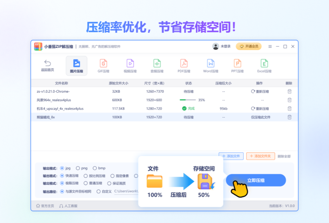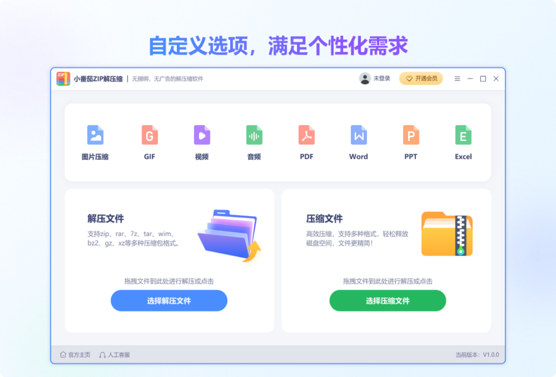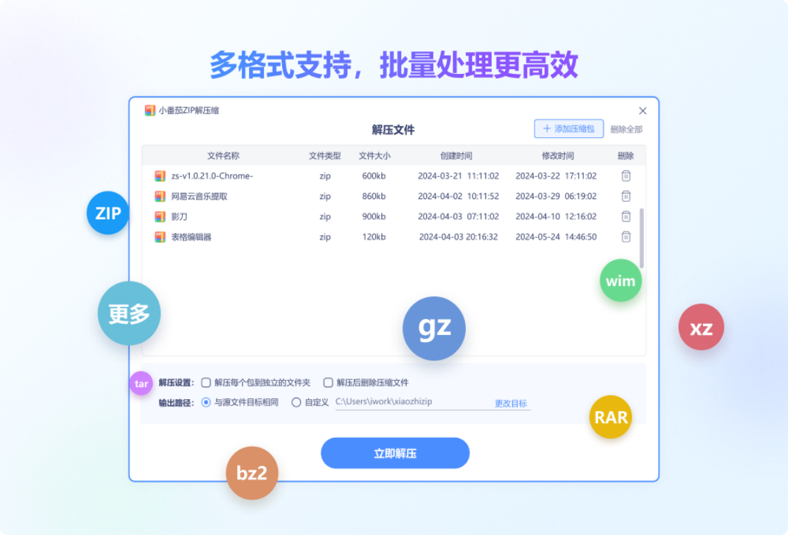小番茄zip解压缩,是一款非常好用的解压缩工具,除了常见的文件压缩跟解压缩外,针对图片压缩,视频压缩,音频压缩,GIF压缩,PDF压缩,WORD压缩,PPT压缩,EXCEL压缩8大文件类型优化了压缩算法,大大提升特定格式的压缩效率跟压缩比,满足不同用户需求场景。软件支持解压的格式有zip、rar、7z、tar、wim、bz2、gz、xz等多种压缩包格式的解压;同时针对文件、图片、视频、音频、PDF以及日常办公文档等支持压缩成多种格式压缩包,支持设置密码,以及密码跨设备同步,方便安全,带来了非常高效便捷的使用体验,提升工作效率。