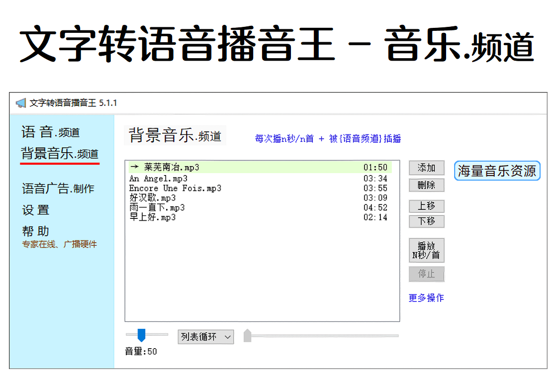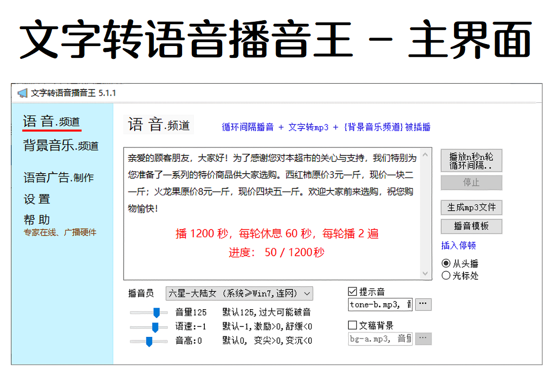 文字转语音播音王,文字转语音播报软件,循环间隔播音,用于中小超市/生鲜店促销等。 语音频道:每次循环间隔播音n秒或n轮,可设置每轮的间隔;背景音乐频道:每次播放n秒或n首,语音频道播出时,背景音乐频道降低音量或静音。1. 真人发声,可单机使用,中英文/台湾/粤语多国语言。2. 提示音,语速,插入停顿,文稿背景音乐,播音模板。3. 可放大语音音量,因为讲话的音量天然比唱歌呐喊小。4. 语音广告制作:背景音乐+语音混音穿插,合成mp3。5. 多种音频格式,列表单曲/顺序/随机播放,末尾淡出。6. 淘宝 {歌曲代下载},DeepSeek找歌单 {某类歌20首}。
