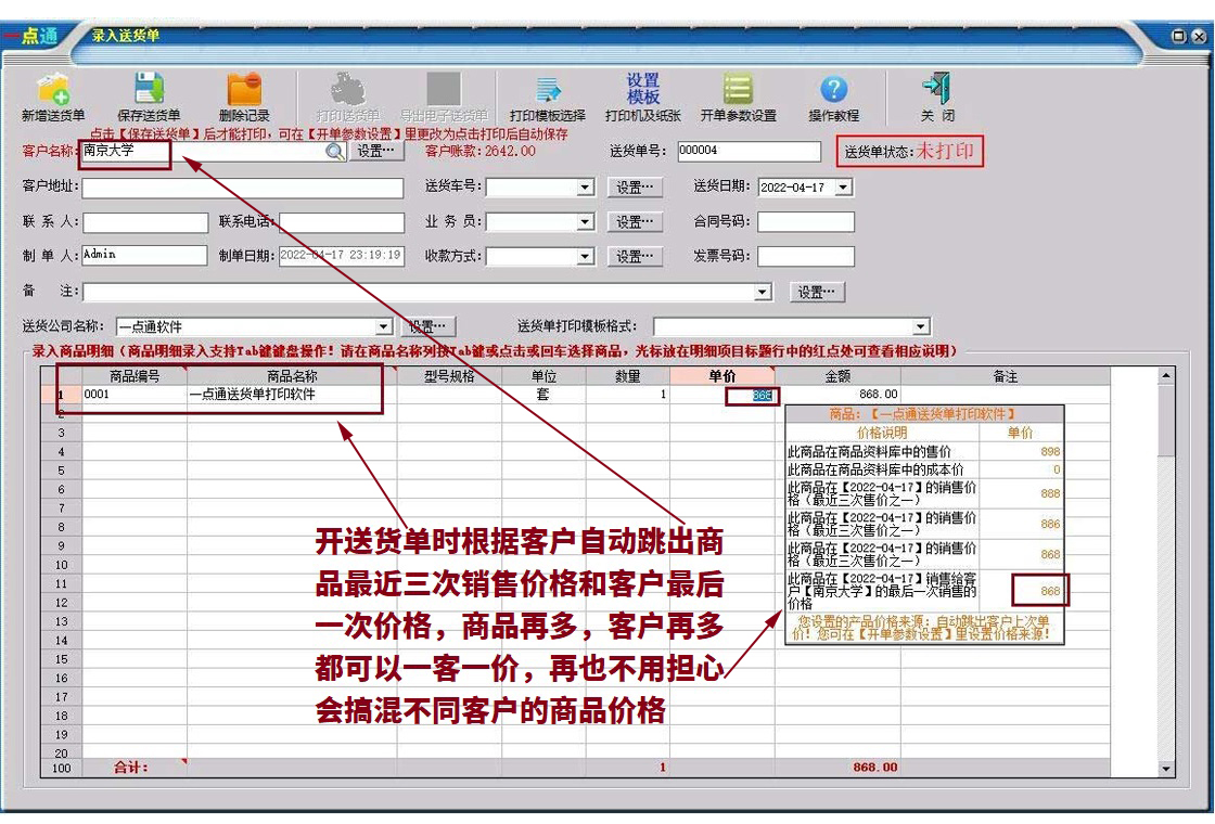 一点通送货单打印软件是一款集送货单打印管理、销售单打印管理、发货单打印管理、出货单打印管理、销售收款(应收款管理)等功能为一体打印的送货单打印软件,支持一客一价,可方便的自动生成对账单,账目明了。客户的欠账,送货数量,送货明细,都可以方便的查询和打印。操作简单,方便,实用,专业,是此软件的特点。